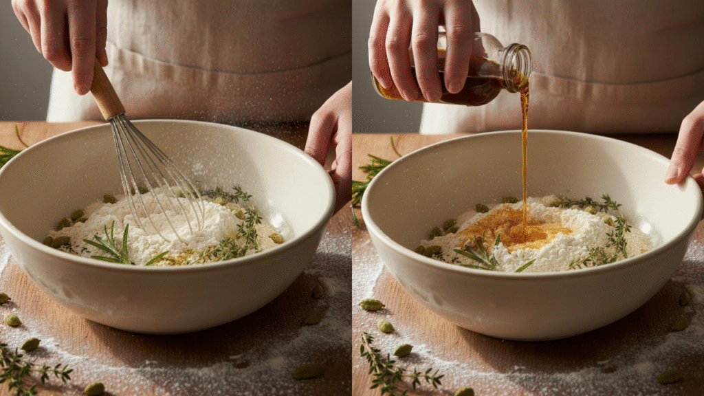 Pour the wet mixture into the dry ingredients and stir until a shaggy dough forms. Then knead by hand for about 5–7 minutes until it feels elastic. Don’t overdo it — a little softness keeps it tender.