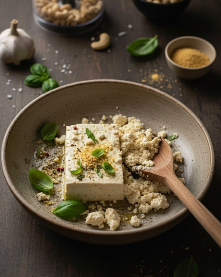 - For tofu: crumble tofu in a bowl, add nutritional yeast, lemon juice, olive oil, garlic powder, herbs, salt, and pepper. Mash or blend until creamy.