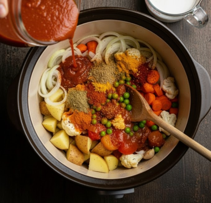 In your slow cooker, add onion, garlic, ginger, red pepper, carrots, and potatoes (or cauliflower). Pour in the tomato puree, coconut milk, and maple syrup. Sprinkle in all your spices — garam masala, coriander, cumin, turmeric, paprika, and cayenne. Give it a good stir.