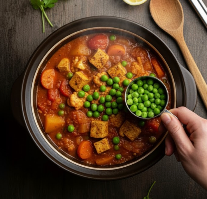 About 10–15 minutes before serving, stir in frozen peas (if using). Adjust the salt and spice level, then squeeze in a little lemon or lime juice for freshness.